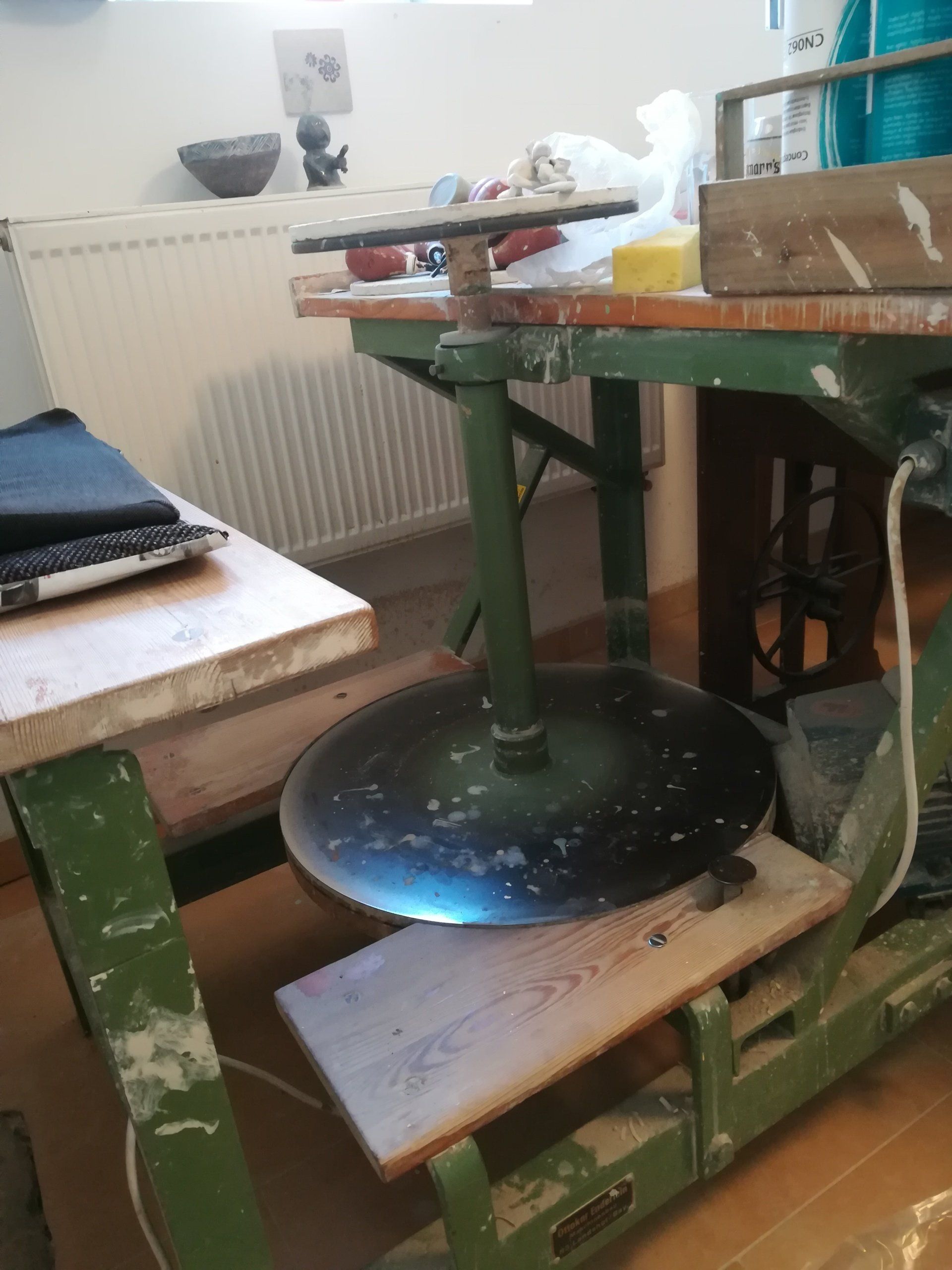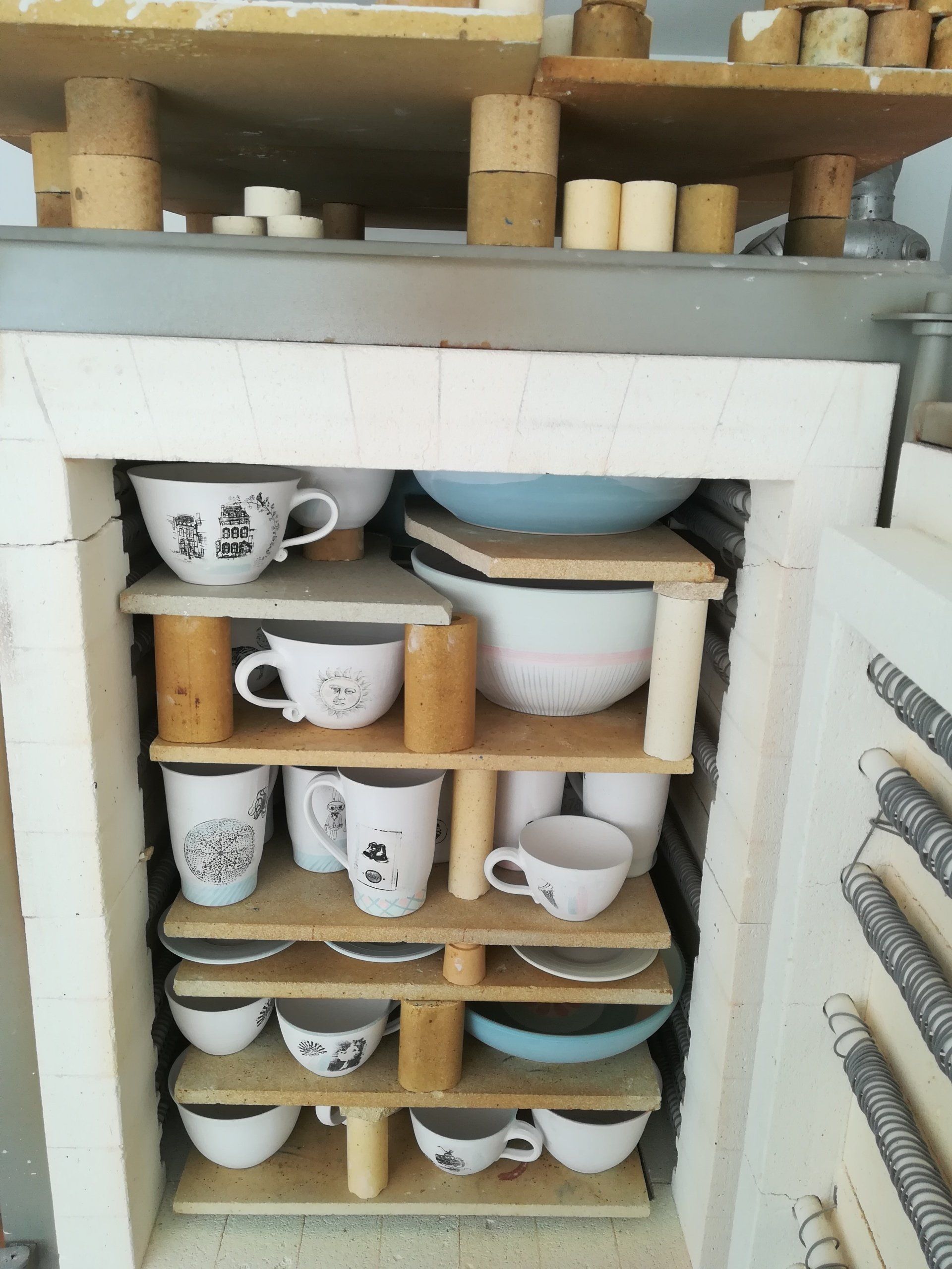 Bei meiner Keramik handelt es sich um hochgebrannten Steinzeugton. Die Herstellung erfolgt meist auf der Drehscheibe. Die Töpferware wird oft bedruckt, bemalt, glasiert und wandert dann ein zweites Mal bei 1230 °C in den Brennofen. Sie ist besonders stoßfest, winterfest und kann gerne in die Spülmaschine gesteckt werden. Ein kleiner Arbeitsplatz befindet sich im Ladenraum und mit etwas Glück könnt ihr bei der Herstellung zusehen. Gerne können wir auch in die Werkstatt im Hinterhaus spitzen.